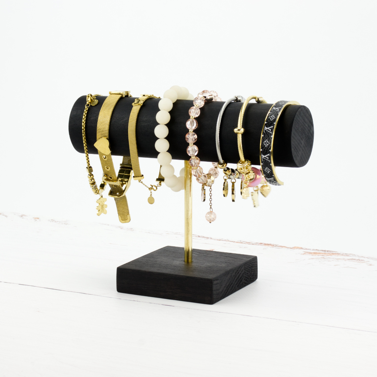 Wybierz ten unikalny stojak na zegarki lub bransoletki, jeśli cenisz minimalistyczne elementy. Drewniany wieszak osadzony na mosiężnym stelażu z drewnianą podstawą to gwarancja satysfakcji. Jest łatwy w utrzymaniu w czystości i umożliwia powieszenie około 8-10 bransoletek.