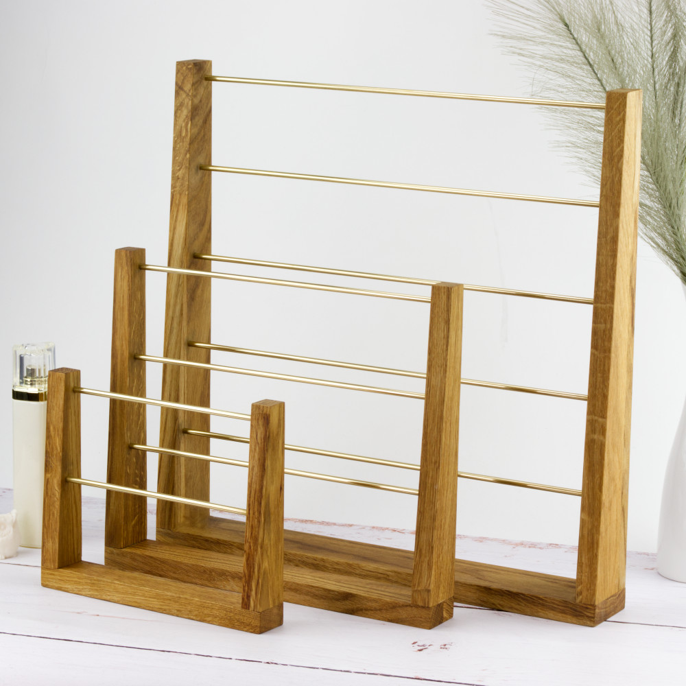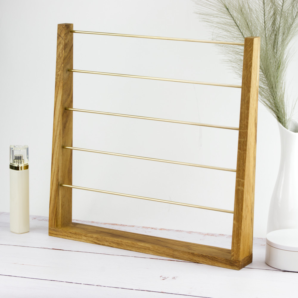 Designerski stojak na kolczyki stworzony z miłością do piękna w polskiej pracowni rzemieślniczej zachwyca dokładnym wykonaniem i symetryczną budową. Połączenie drewna dębowego z mosiężnymi poprzeczkami sprawiają, że efekt wizualny jest niezwykle efektowny.