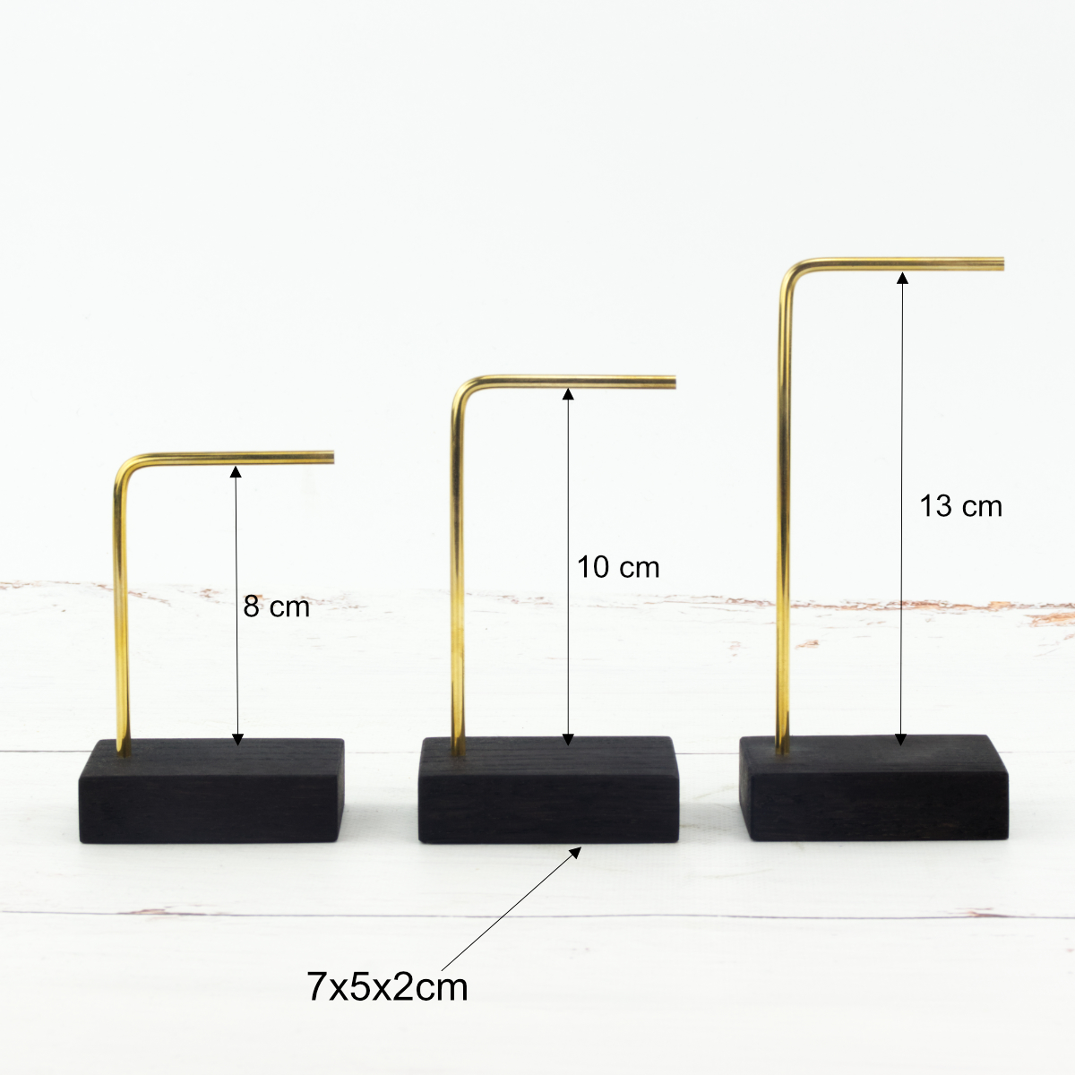 Ten ekspozytor na biżuterię możesz zamówić w jednym z trzech kolorów: ciemnobrązowym, naturalnie dębowym oraz czarnym. Oprócz wybarwienia masz do wyboru również rozmiar stojaka. Podstawka ma wymiary 7x5x2 cm, stelaże są szerokie na 6 cm, a ich wysokość to 10, 12 i 15 cm.