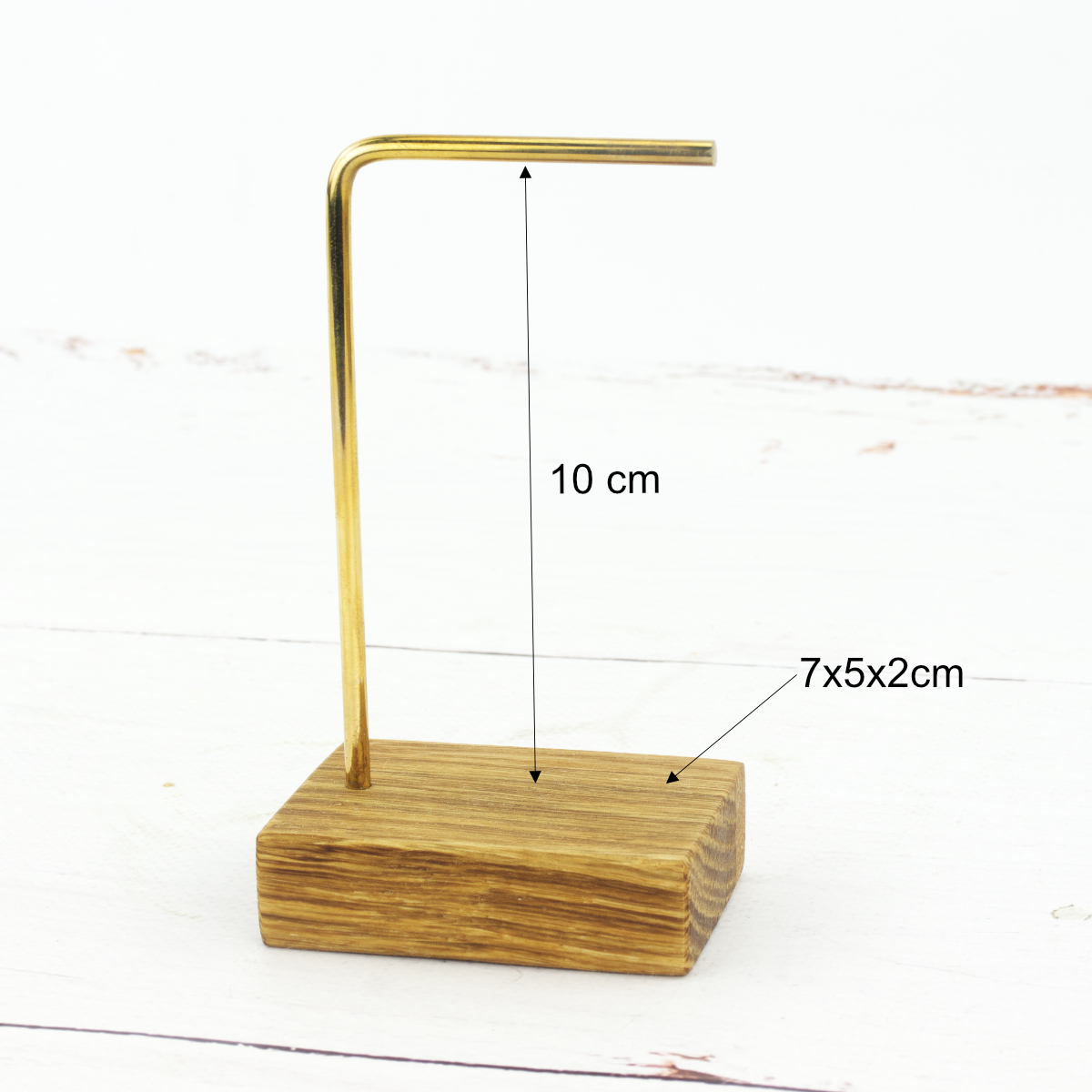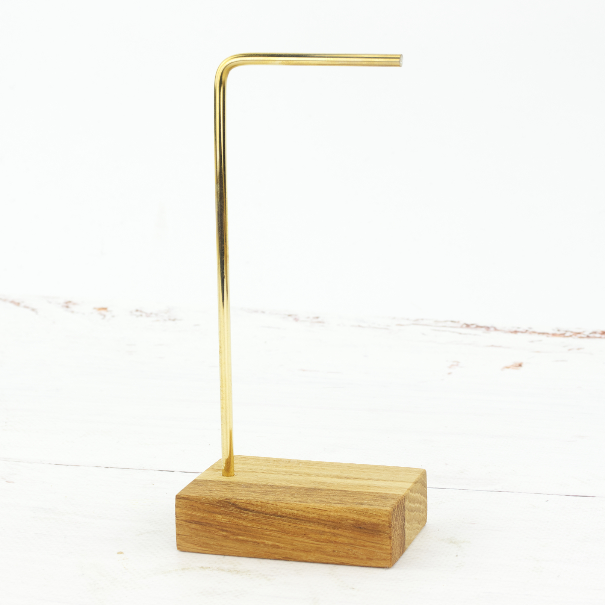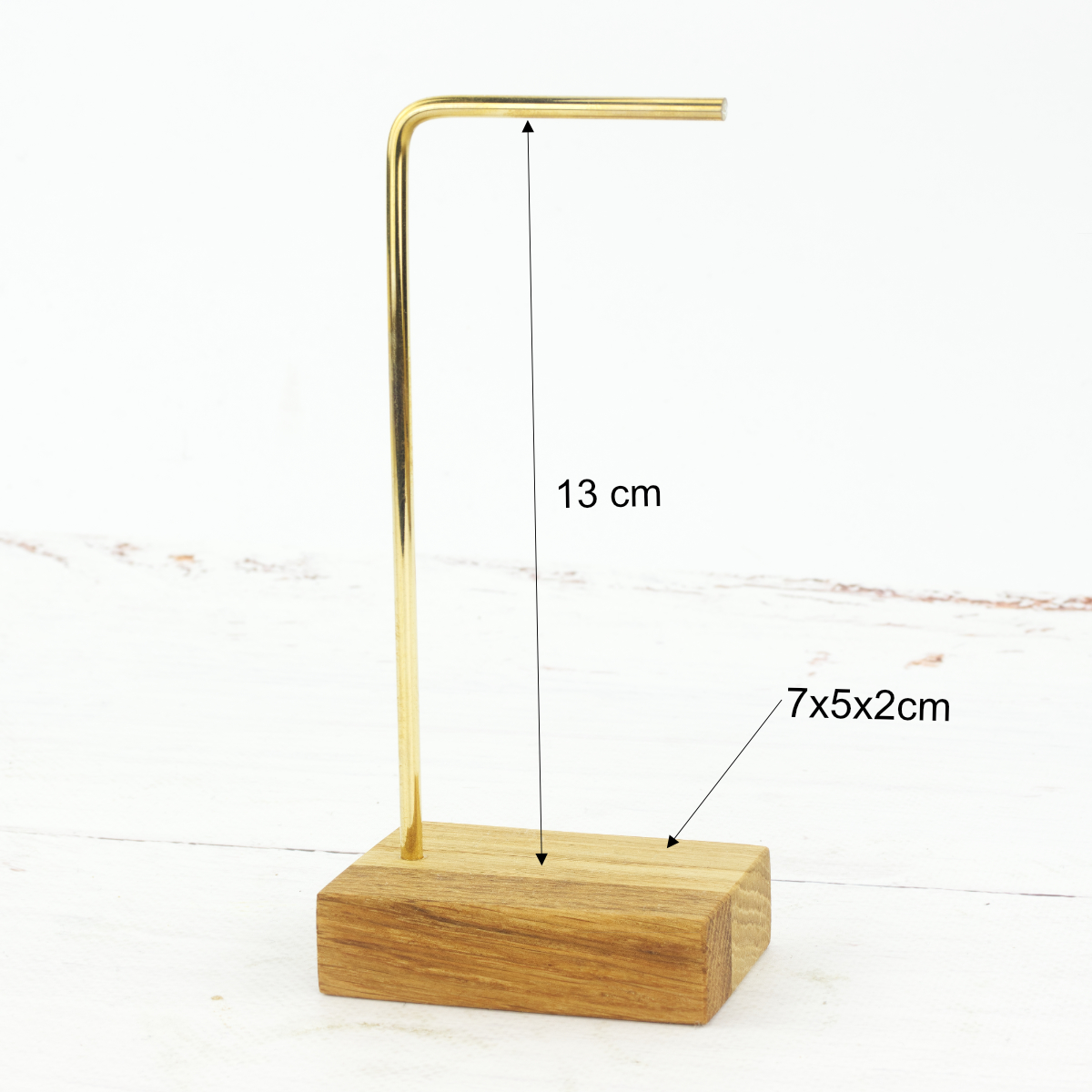 To Twój stylowy i elegancki sposób na przechowywanie biżuterii w domu lub ekspozycję w butiku. Poznaj kompaktowy stojak o niezwykle prostej budowie, który zachwyca prostą formą i funkcjonalnością. Solidna podstawa wykonana z drewna dębowego to gwarancja stabilności a delikatny i jednocześnie mocny stelaż z mosiądzu zapewnia optymalną przestrzeń do przechowywania nawet dwóch par kolczyków lub kilku bransoletek.