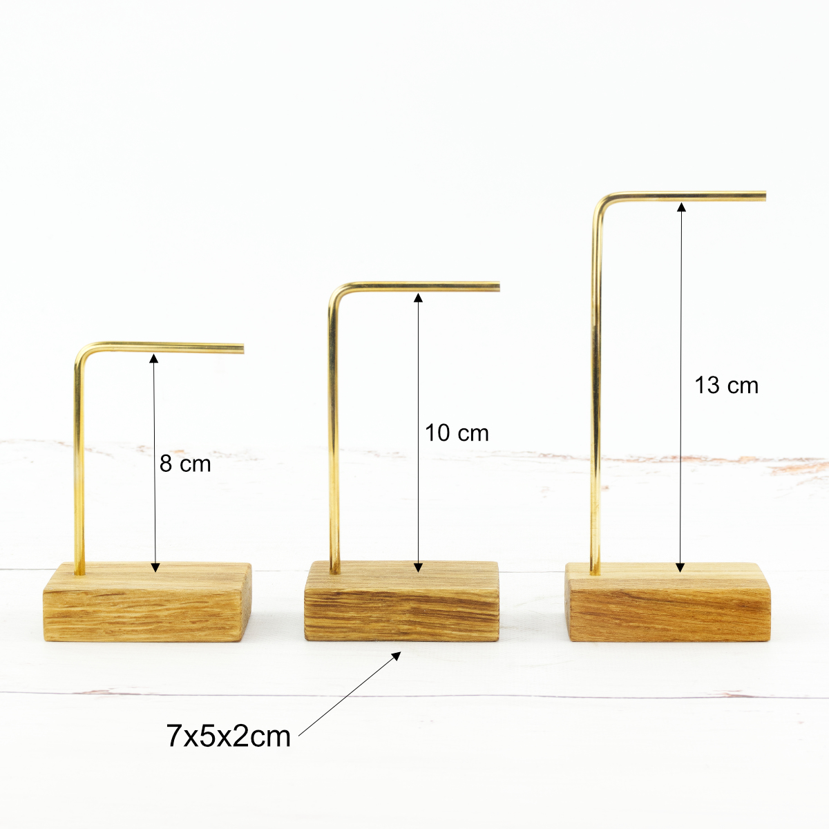 Ten ekspozytor na biżuterię możesz zamówić w jednym z trzech kolorów: ciemnobrązowym, naturalnie dębowym oraz czarnym. Oprócz wybarwienia masz do wyboru również rozmiar stojaka. Podstawka ma wymiary 7x5x2 cm, stelaże są szerokie na 6 cm, a ich wysokość to 10, 12 i 15 cm.