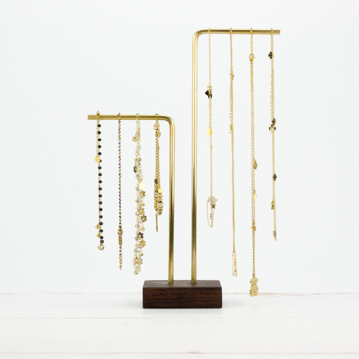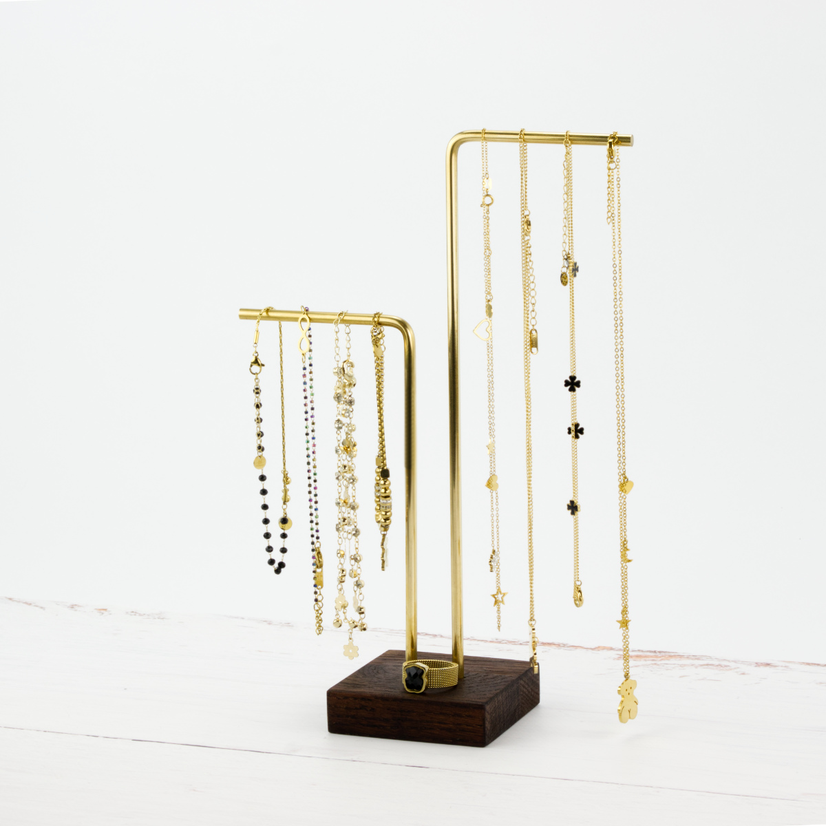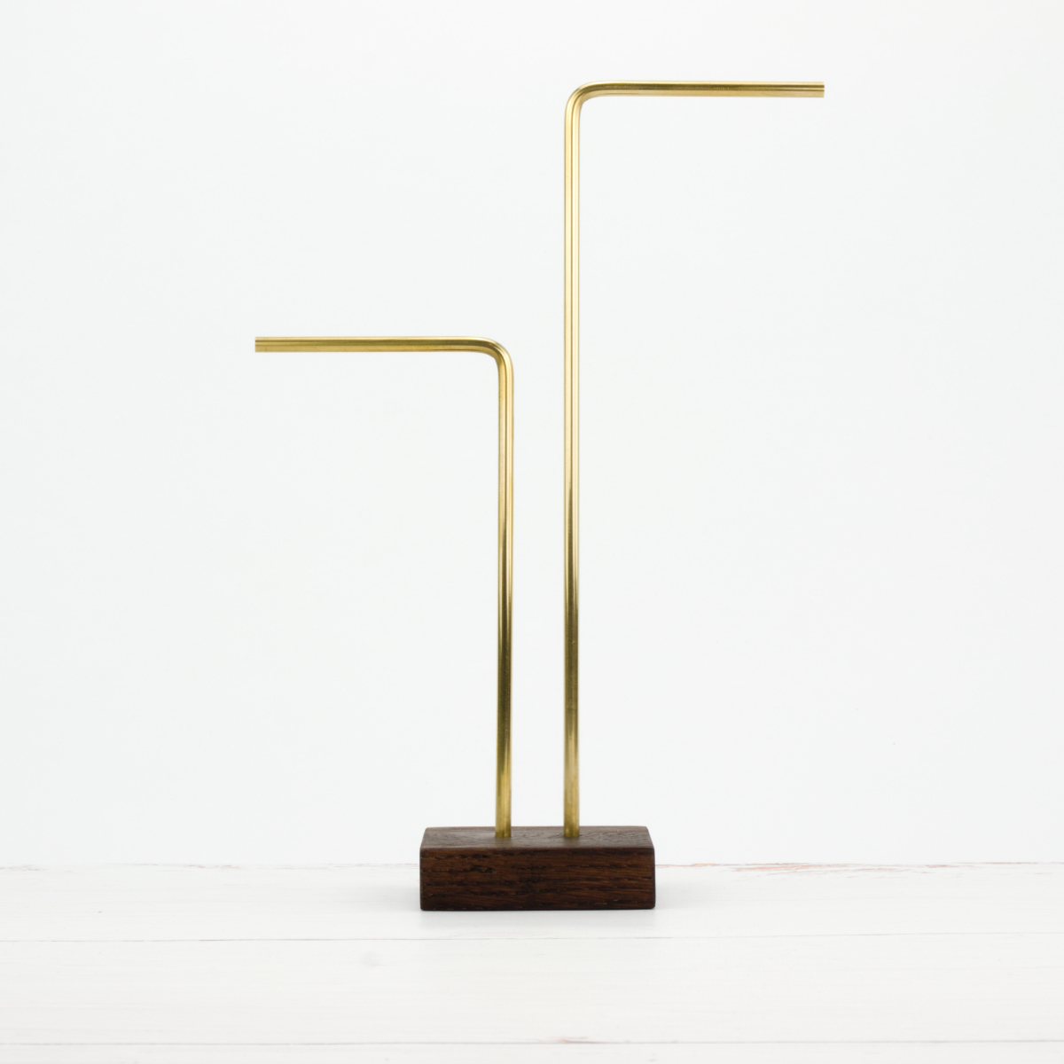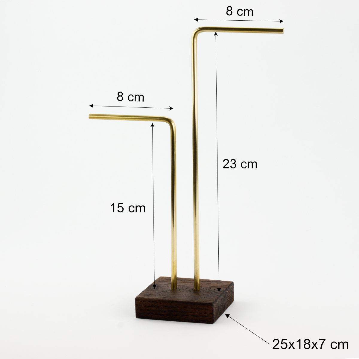 Stojak na kolczyki Duo to ekspozytor, który został stworzony ze starannie wyselekcjonowanego drewna dębowego i mosiądzu. Połączenie drewnianej podstawy z elegancją cienkiego stelaża o łagodnym zaobleniu gwarantuje unikalny efekt wizualny. Jeśli zajdzie taka potrzeba możesz na nim zaprezentować bransoletkę, łańcuszek lub kolczyki wiszące.