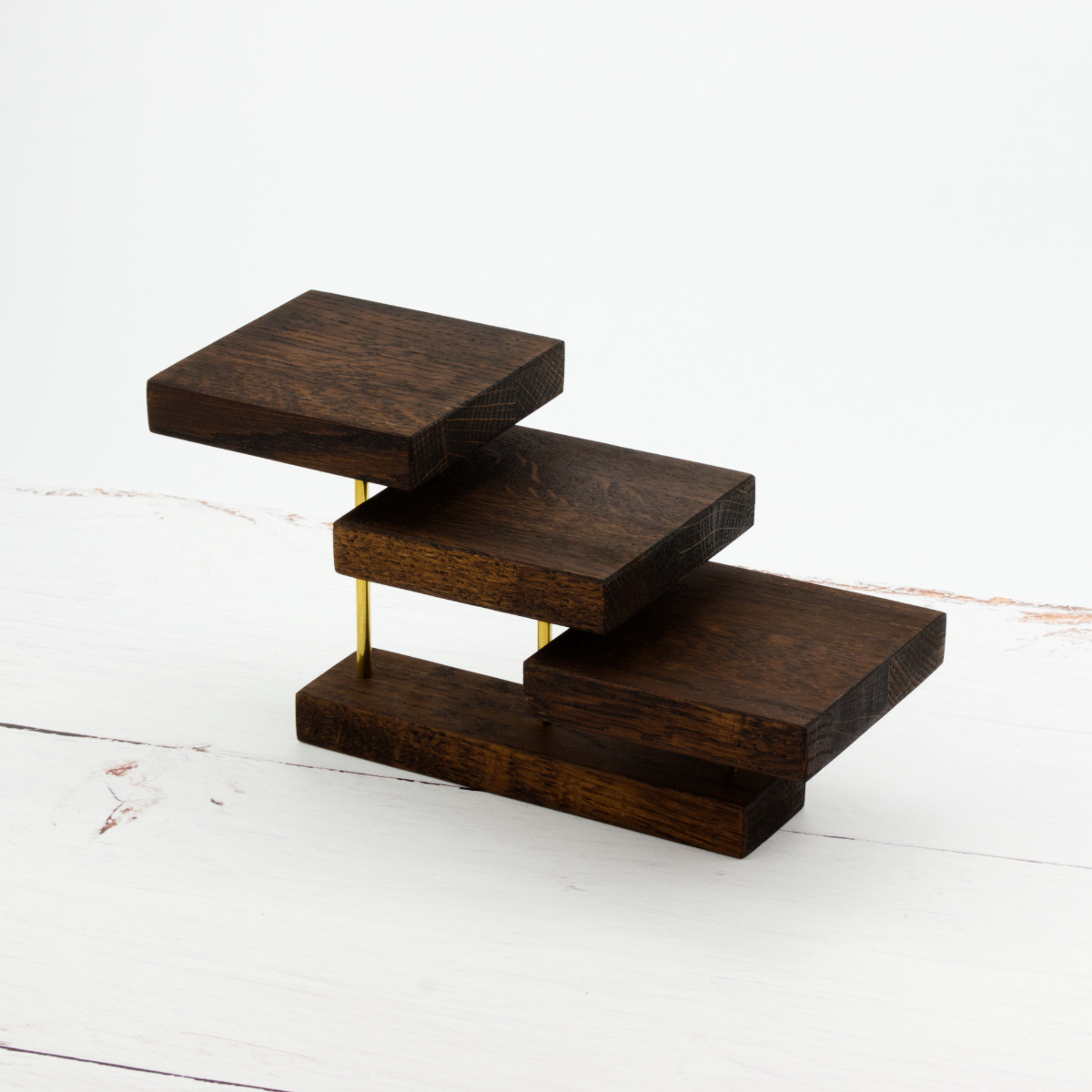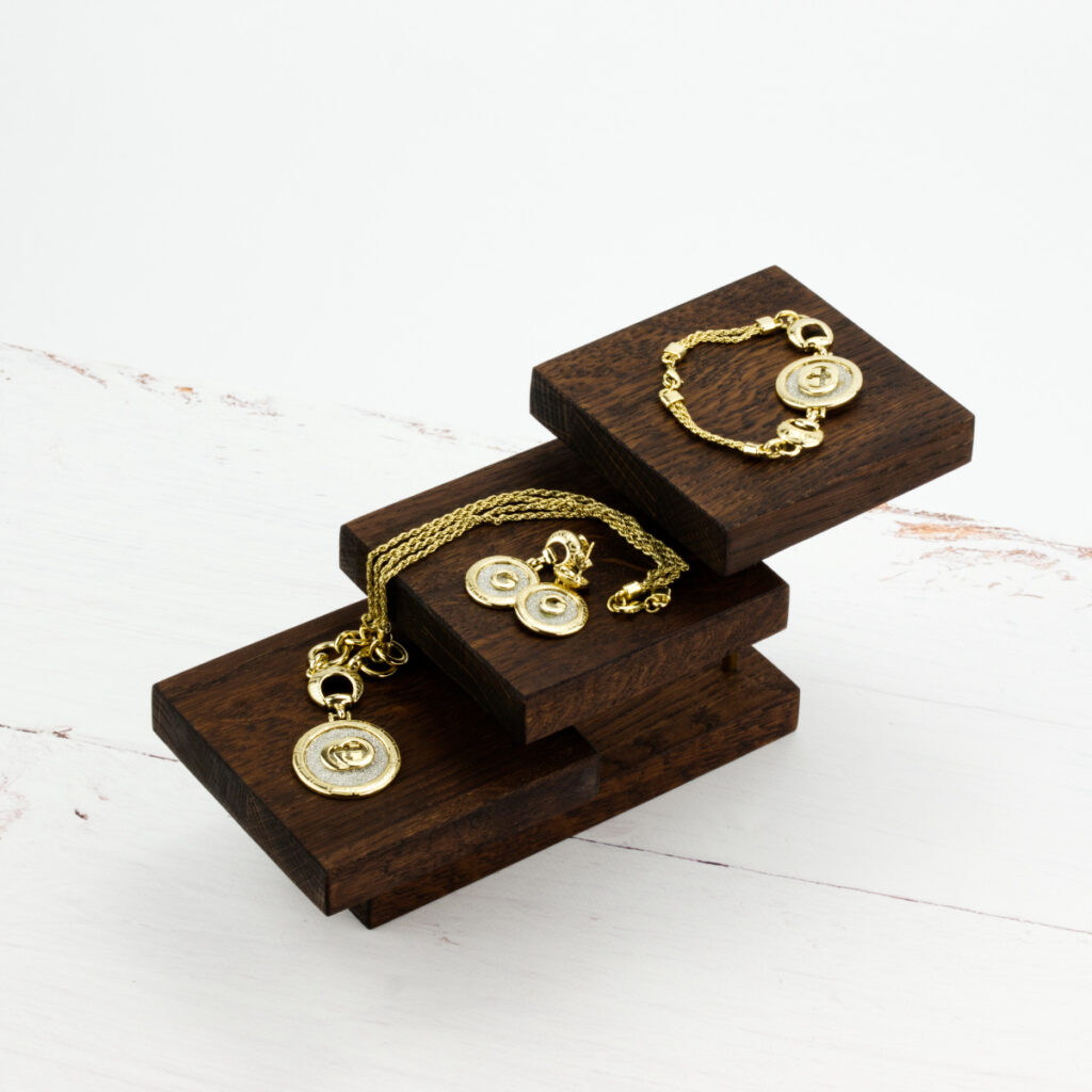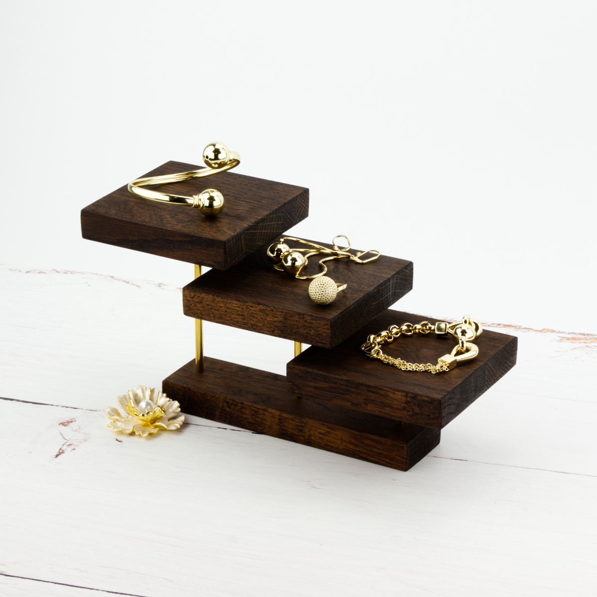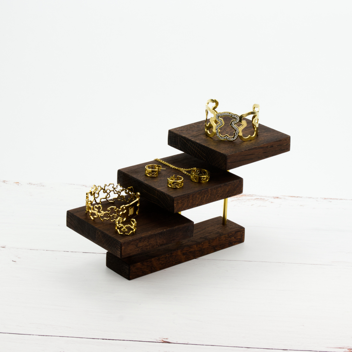 Podstawka na biżuterię, która łączy w sobie trzy wysokości sprawia, że ekspozycja zawsze będzie wyglądała efektownie. Starannie wyselekcjonowane drewno dębowe oraz mosiężne stelaże gwarantują wysoką odporność na uszkodzenia, oraz łatwość w utrzymaniu w czystości.